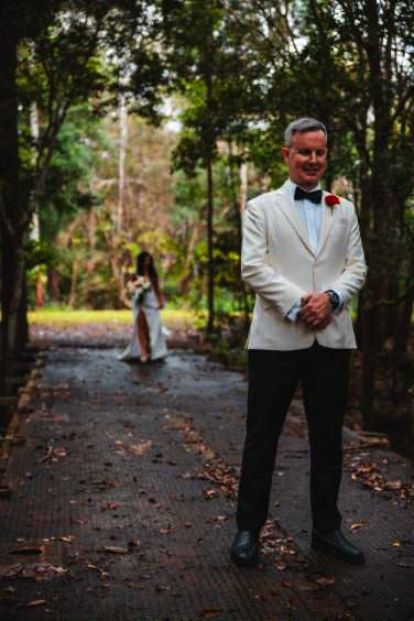 As the bridge opens up, it leads into a lush green space surrounded by tall trees, creating a natural, private sanctuary for your ceremony.
