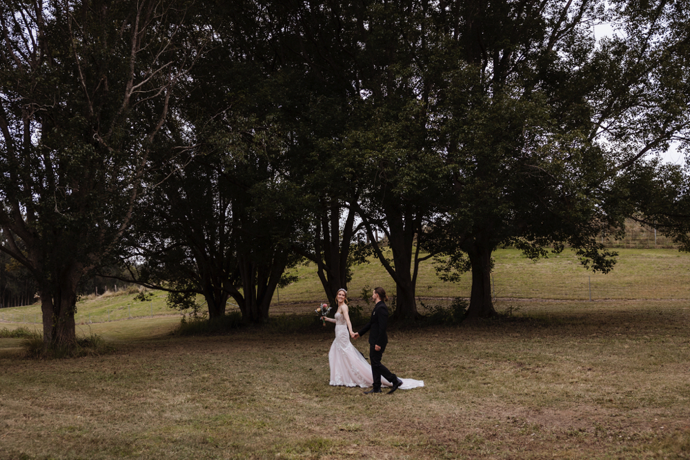 Five Trees is a truly enchanting spot—its beauty and charm are best appreciated in person. Nestled beside the back paddock, the area is lined with towering old trees with sweeping branches that create a grand backdrop. The scale of the trees gently dwarfs the couple, making it a stunning natural setting for wedding photography.